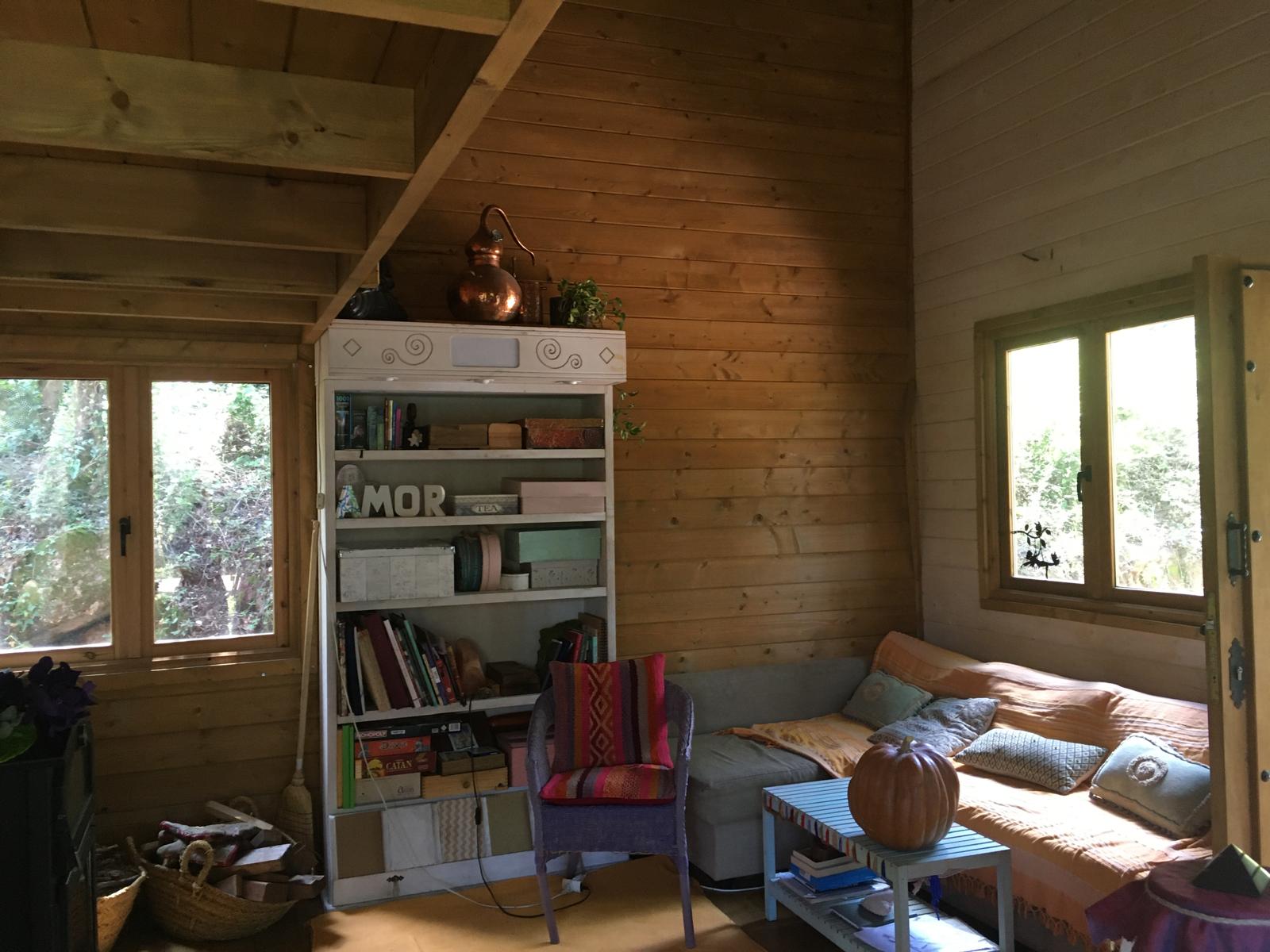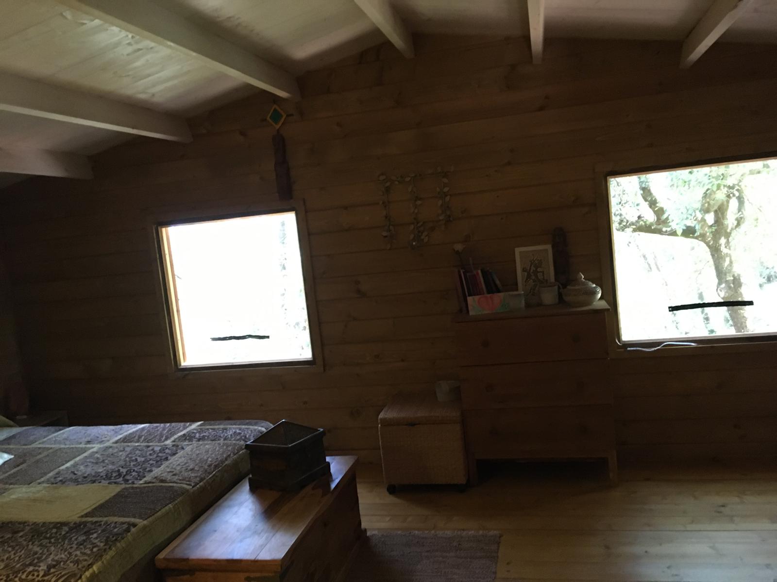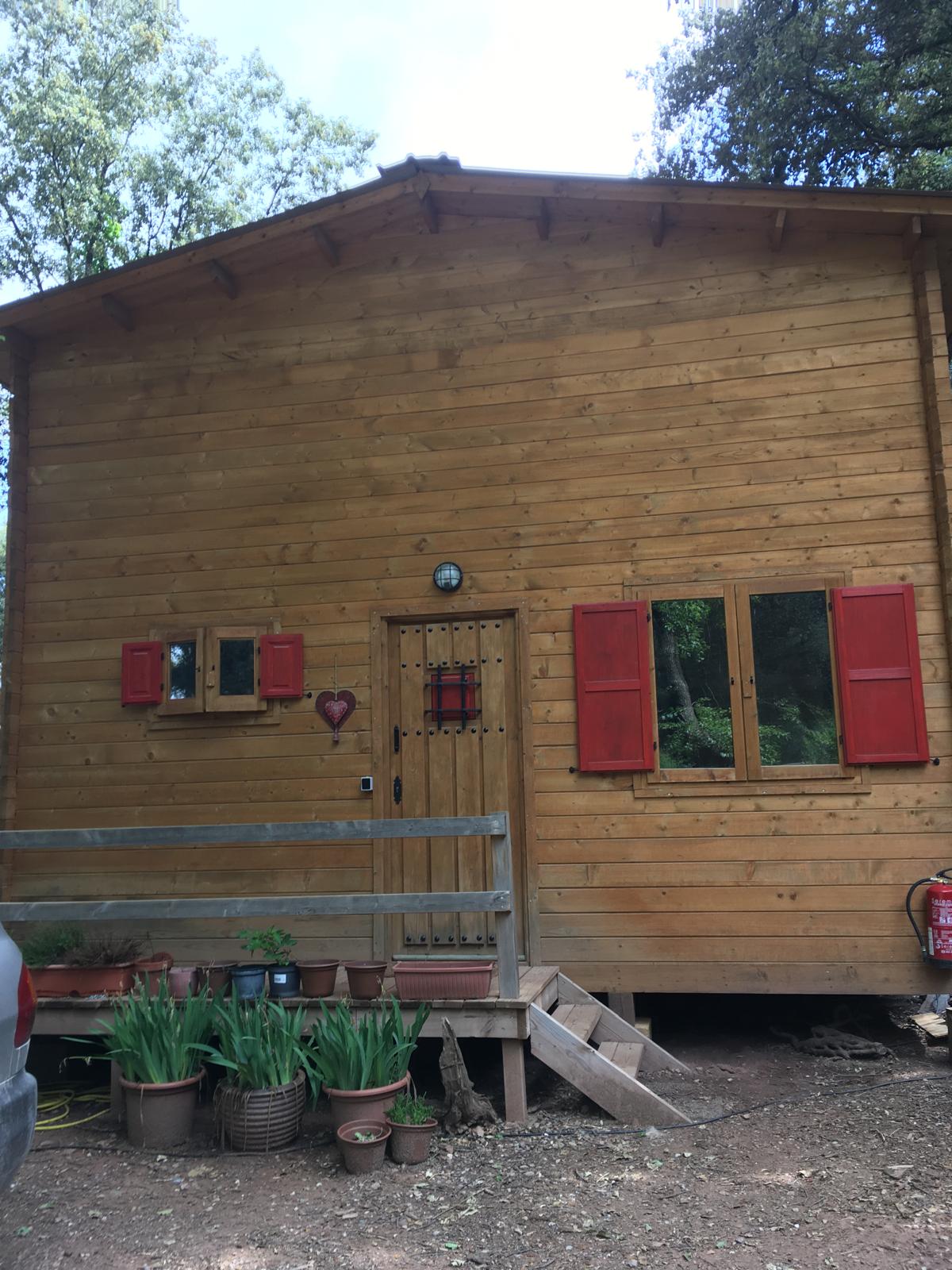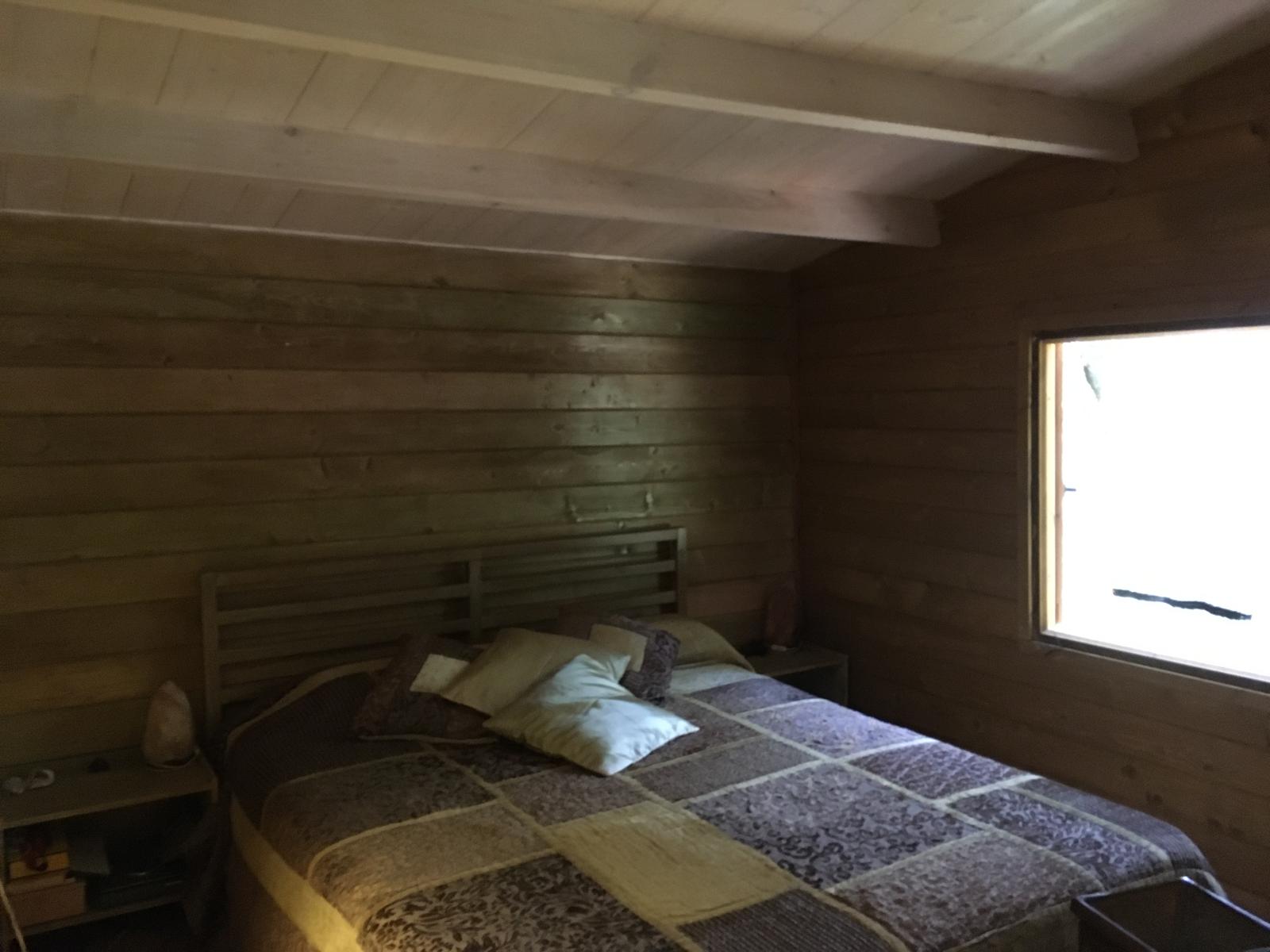 Bungalow de madera, muy luminoso, con más de 80m2 interiores. La planta baja tiene un espacio diáfano en el que hay una cocina, comedor y sala de estar. En la misma planta hay 2 habitaciones y un aseo con ducha. Un ventanal permite salir a la terraza de unos 15 m2. Encima del altillo abierto hay un espacio para despacho y biblioteca y una habitación de 18m2. Se calienta con una chimenea. La casa se vende para desmontar y llevar. No se puede quedar donde está.