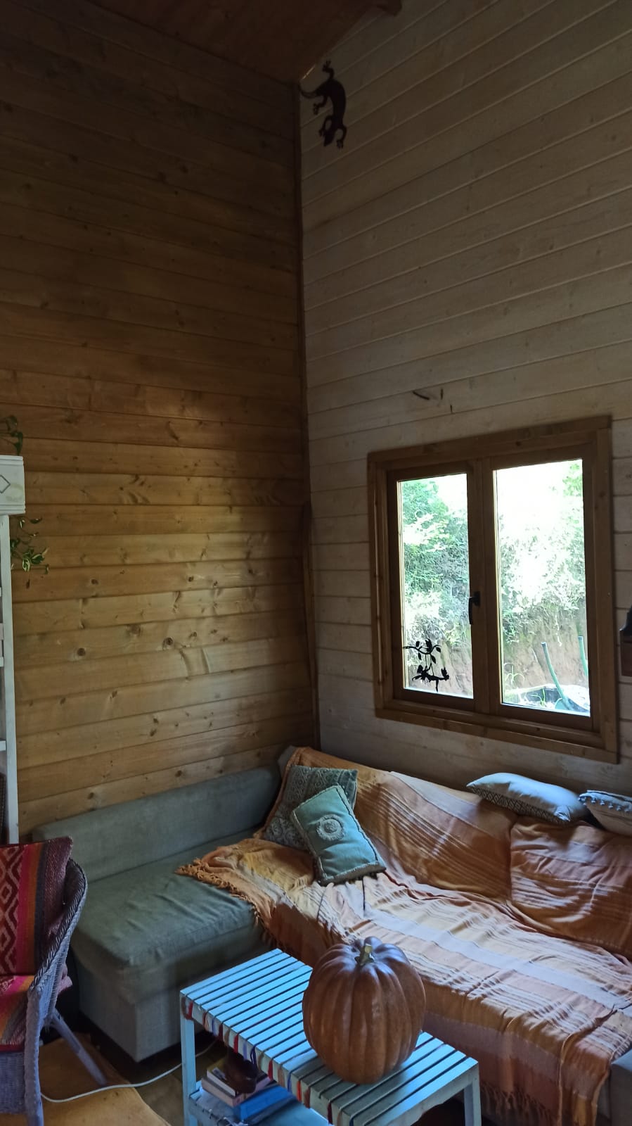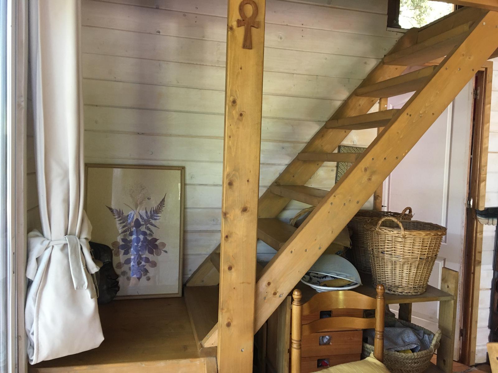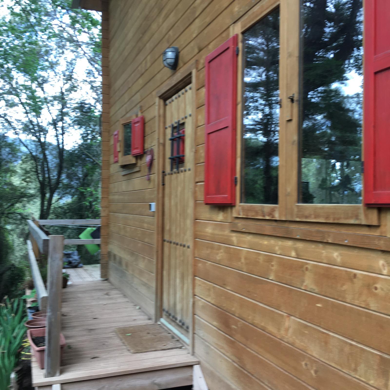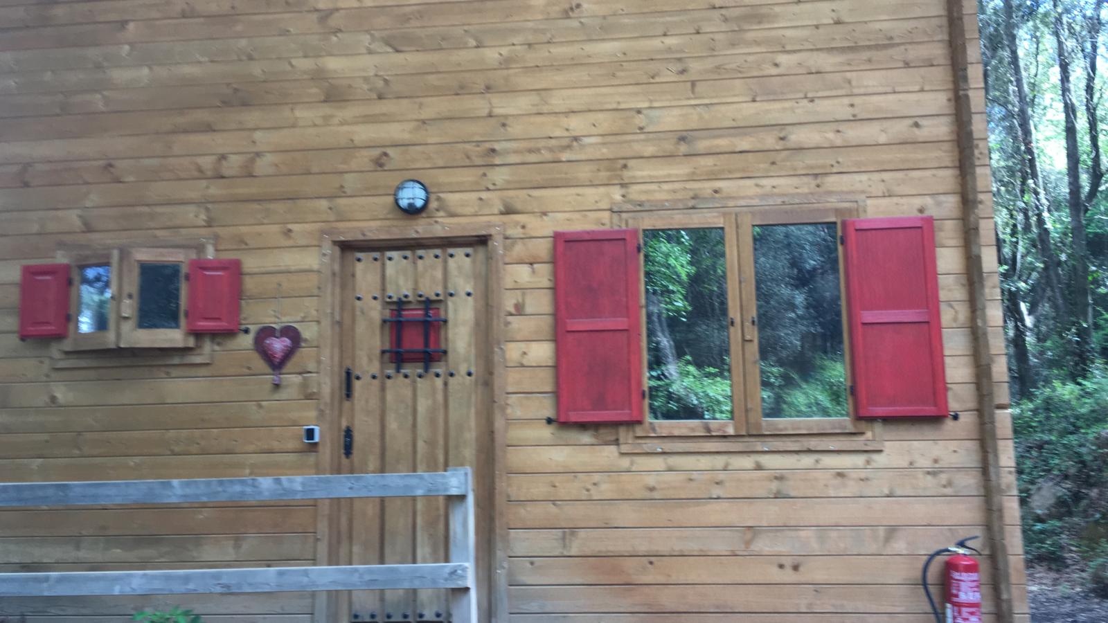 Bungalow de madera, muy luminoso, con más de 80m2 interiores. La planta baja tiene un espacio diáfano en el que hay una cocina, comedor y sala de estar. En la misma planta hay 2 habitaciones y un aseo con ducha. Un ventanal permite salir a la terraza de unos 15 m2. Encima del altillo abierto hay un espacio para despacho y biblioteca y una habitación de 18m2. Se calienta con una chimenea. La casa se vende para desmontar y llevar. No se puede quedar donde está.