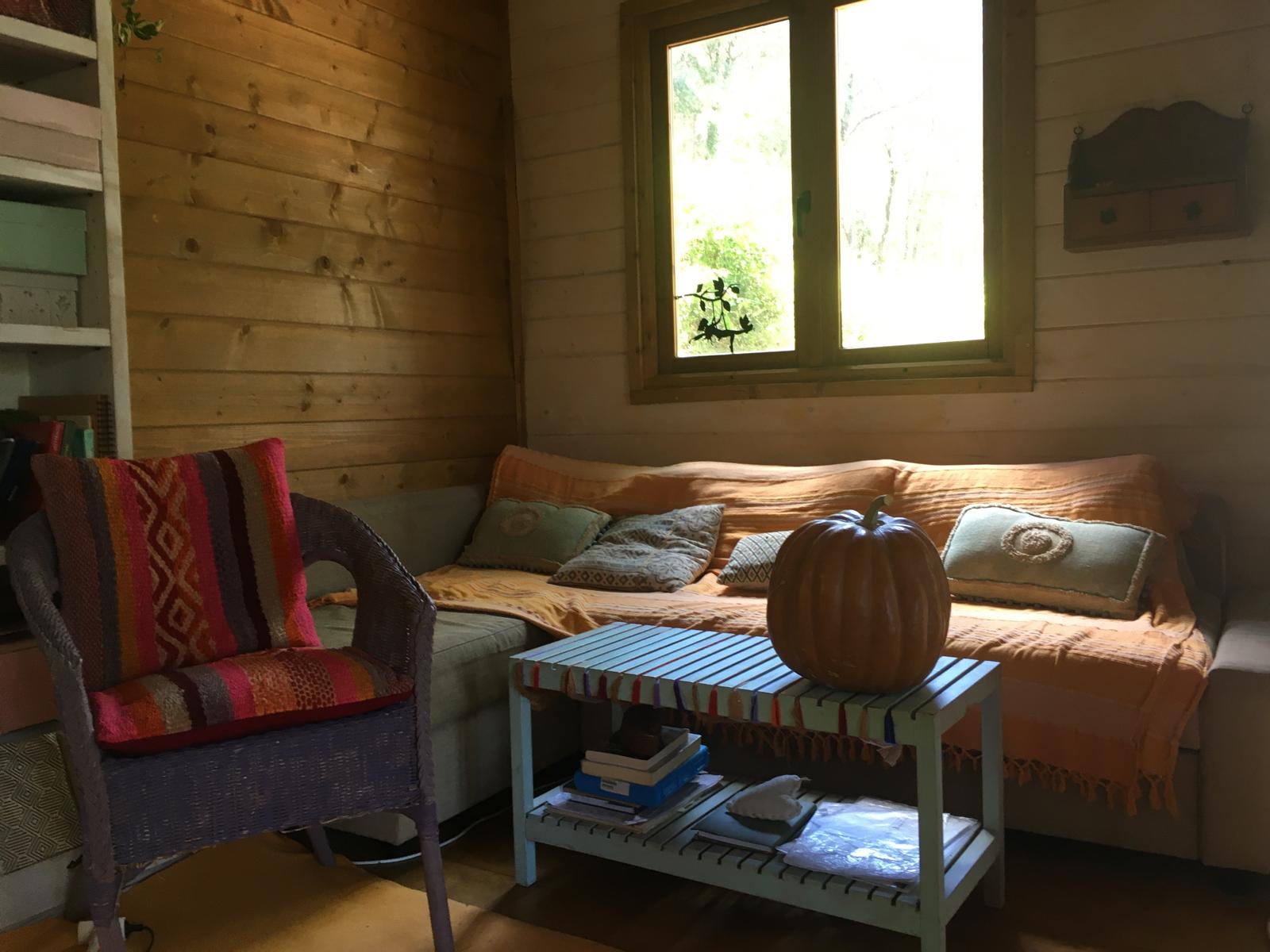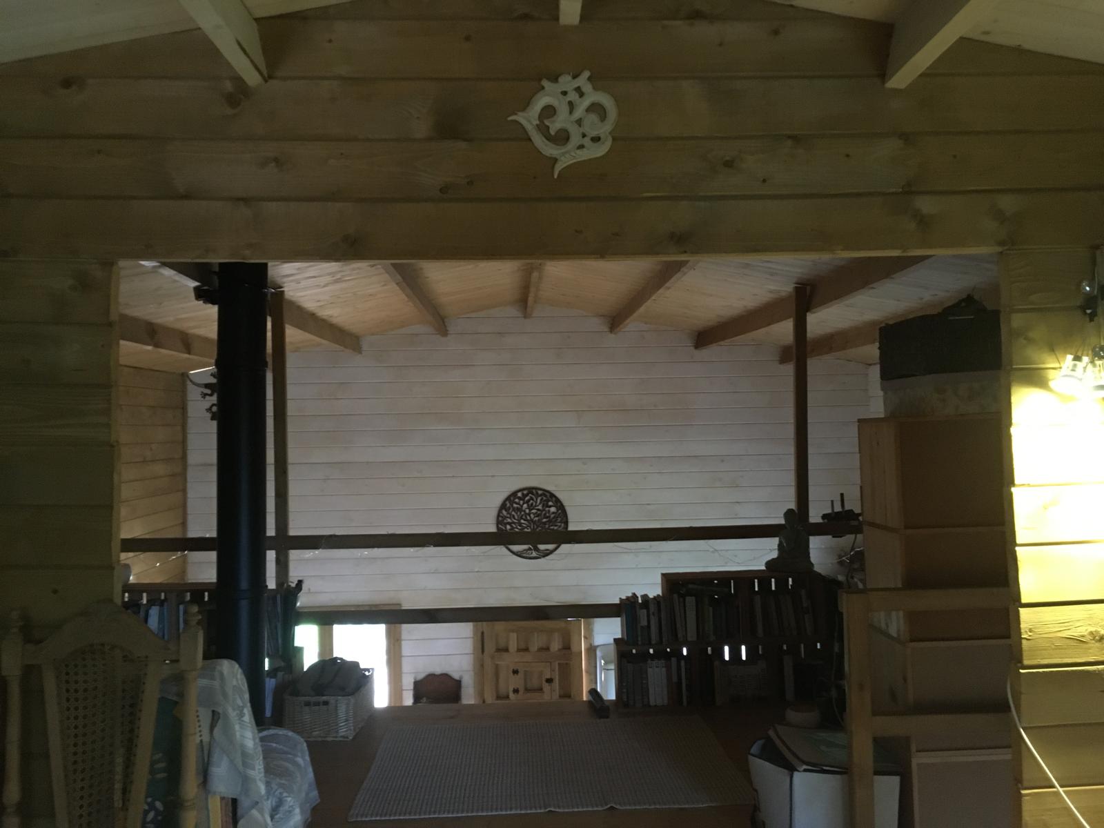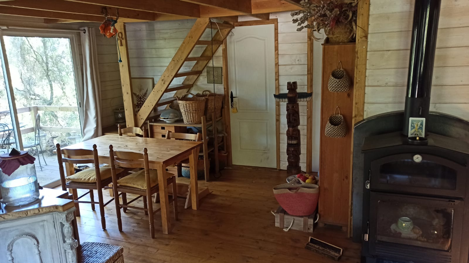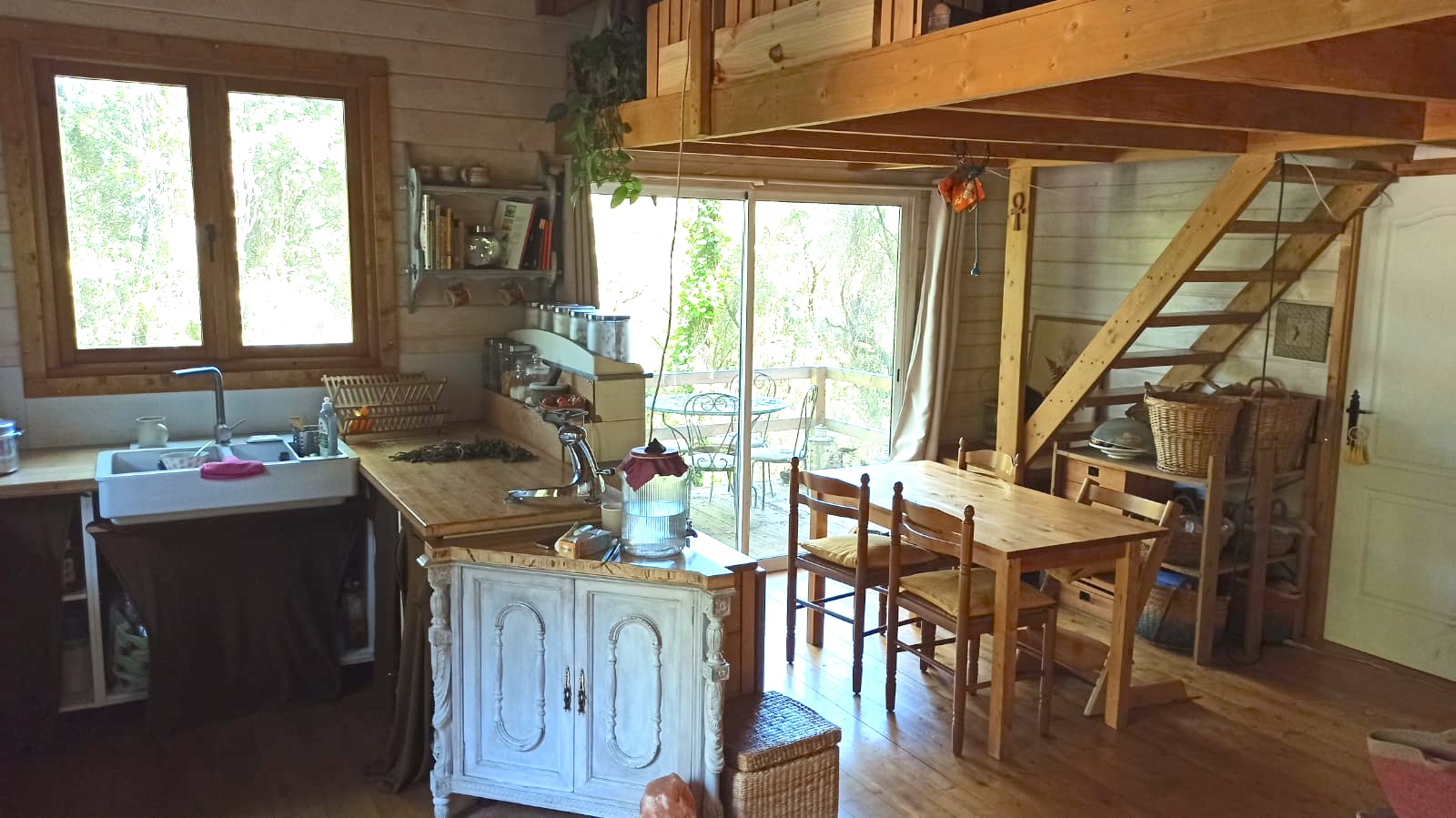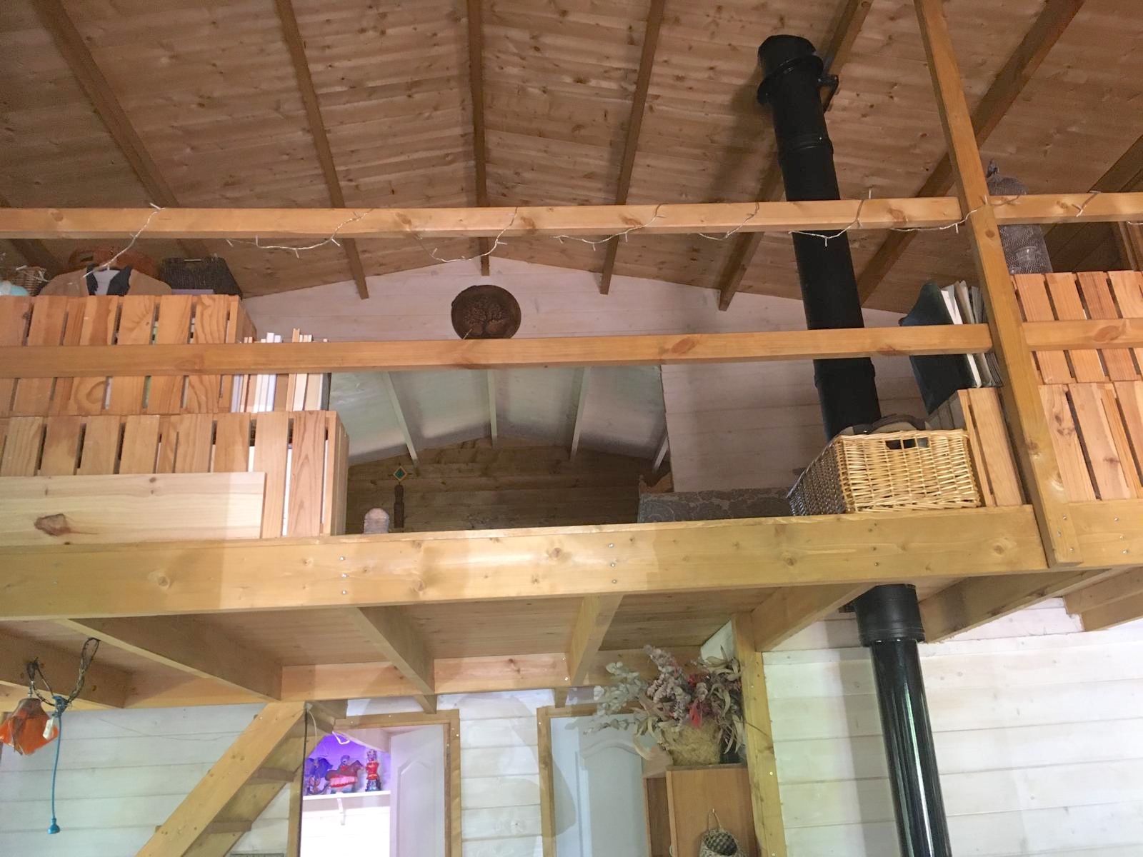 Bungalow de madera, muy luminoso, con más de 80m2 interiores. La planta baja tiene un espacio diáfano en el que hay una cocina, comedor y sala de estar. En la misma planta hay 2 habitaciones y un aseo con ducha. Un ventanal permite salir a la terraza de unos 15 m2. Encima del altillo abierto hay un espacio para despacho y biblioteca y una habitación de 18m2. Se calienta con una chimenea. La casa se vende para desmontar y llevar. No se puede quedar donde está.