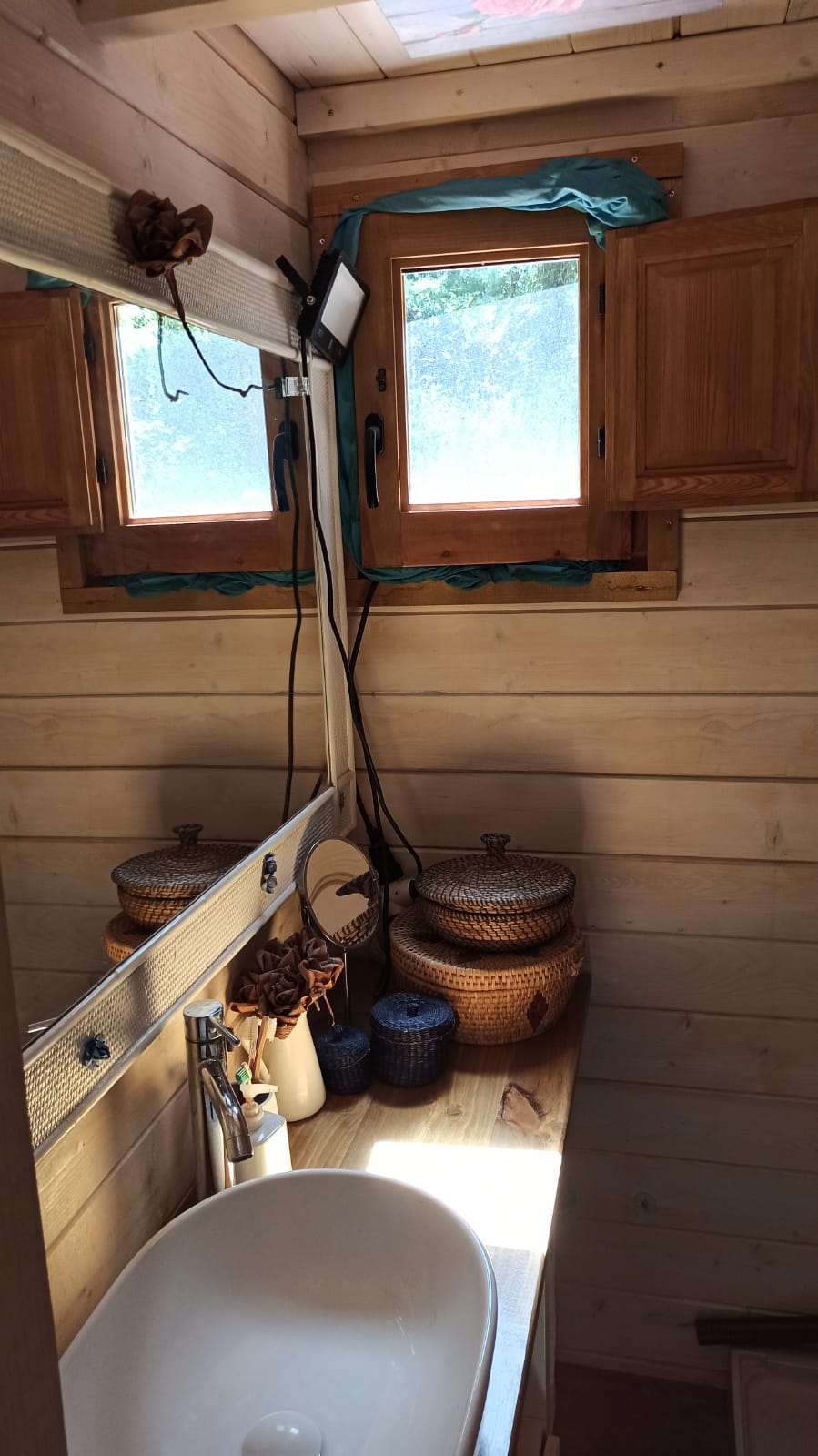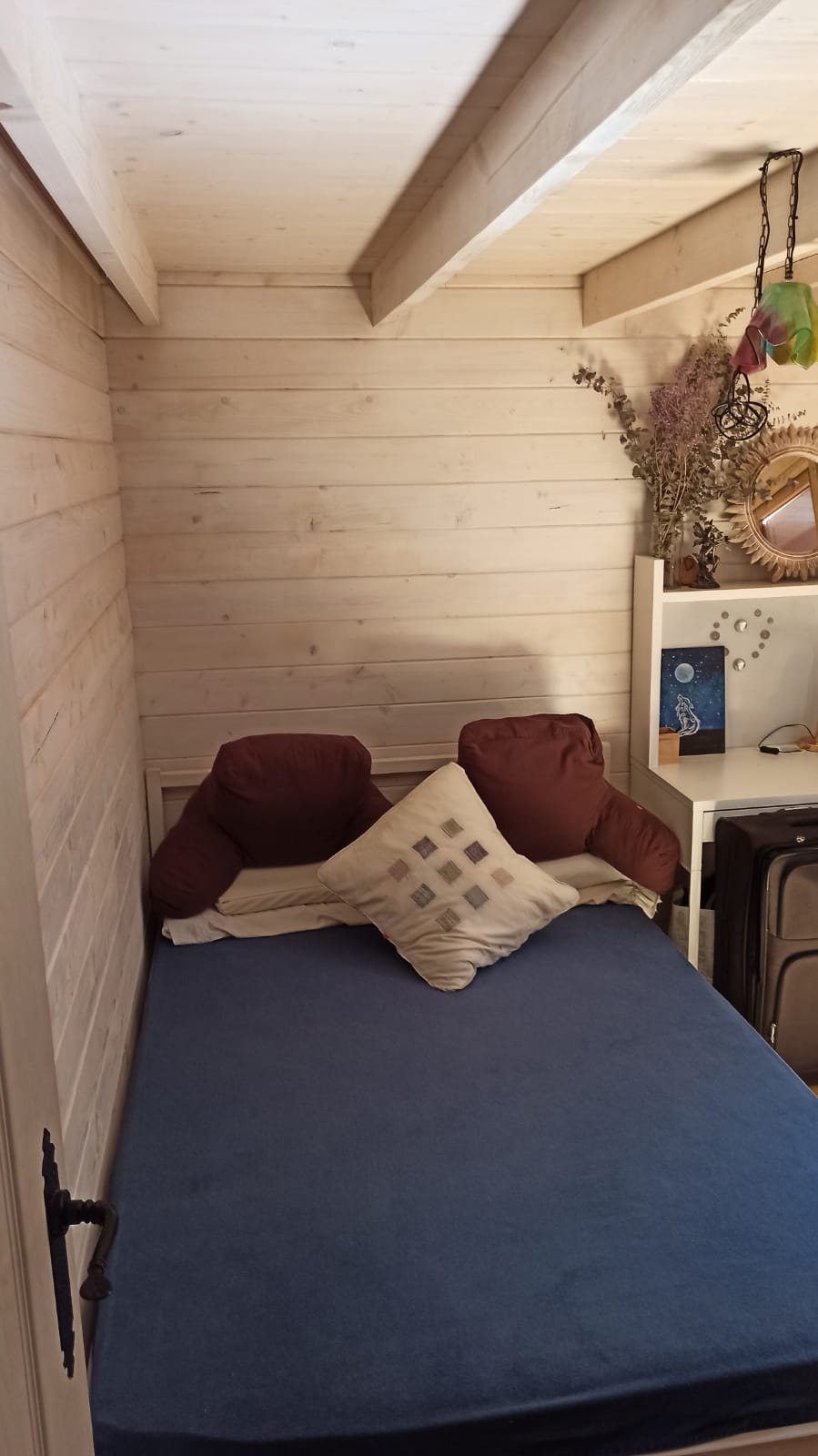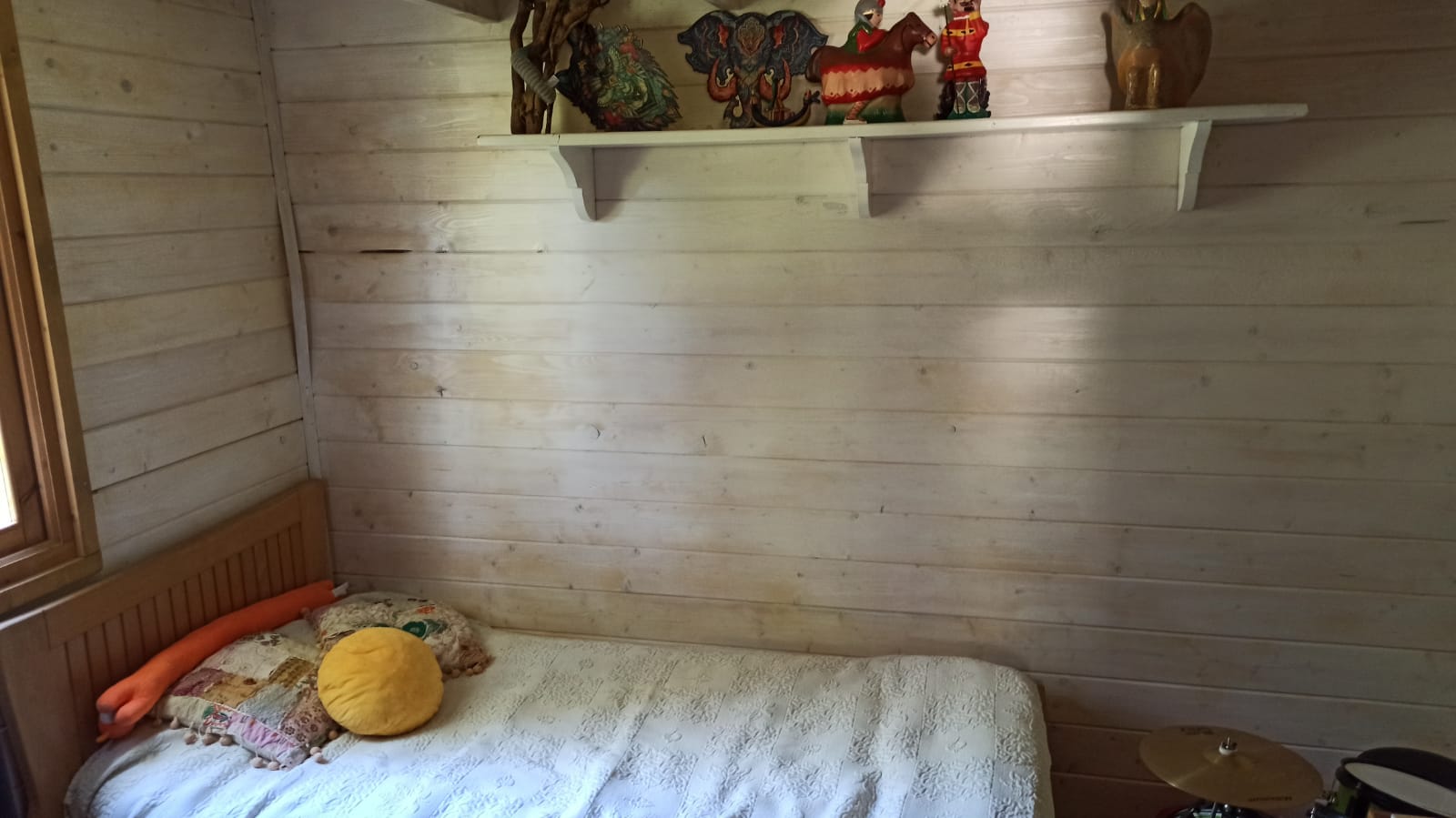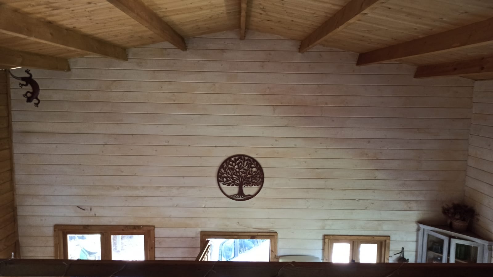 Bungalow de madera, muy luminoso, con más de 80m2 interiores. La planta baja tiene un espacio diáfano en el que hay una cocina, comedor y sala de estar. En la misma planta hay 2 habitaciones y un aseo con ducha. Un ventanal permite salir a la terraza de unos 15 m2. Encima del altillo abierto hay un espacio para despacho y biblioteca y una habitación de 18m2. Se calienta con una chimenea. La casa se vende para desmontar y llevar. No se puede quedar donde está.
