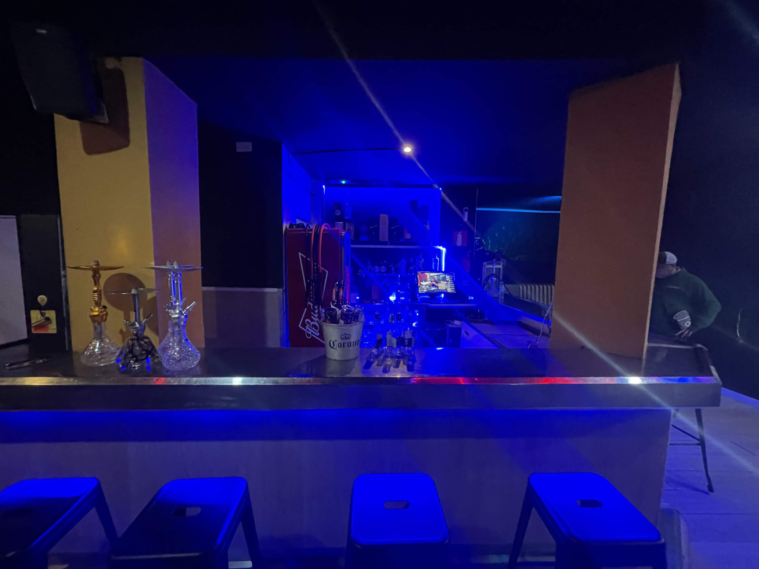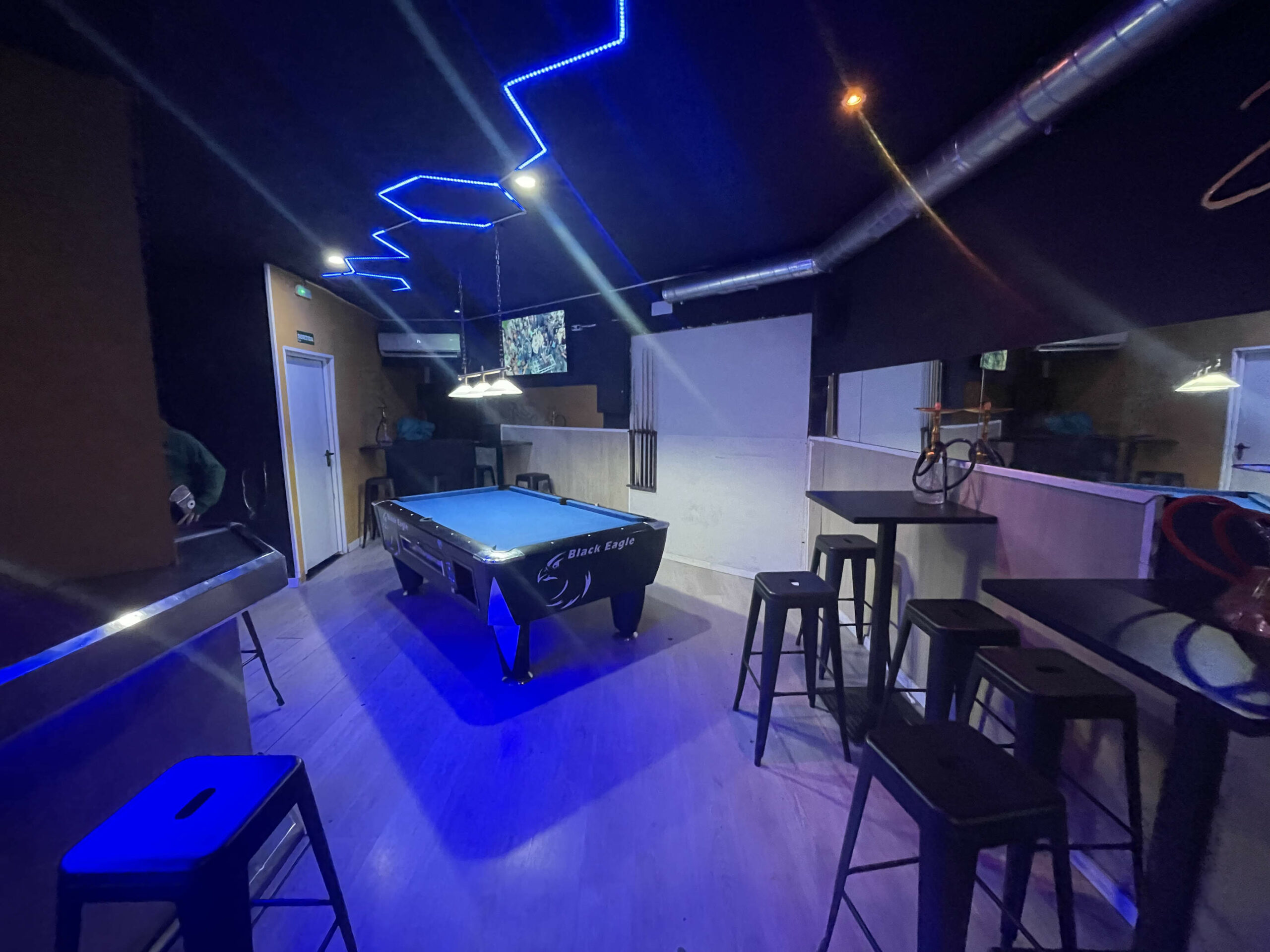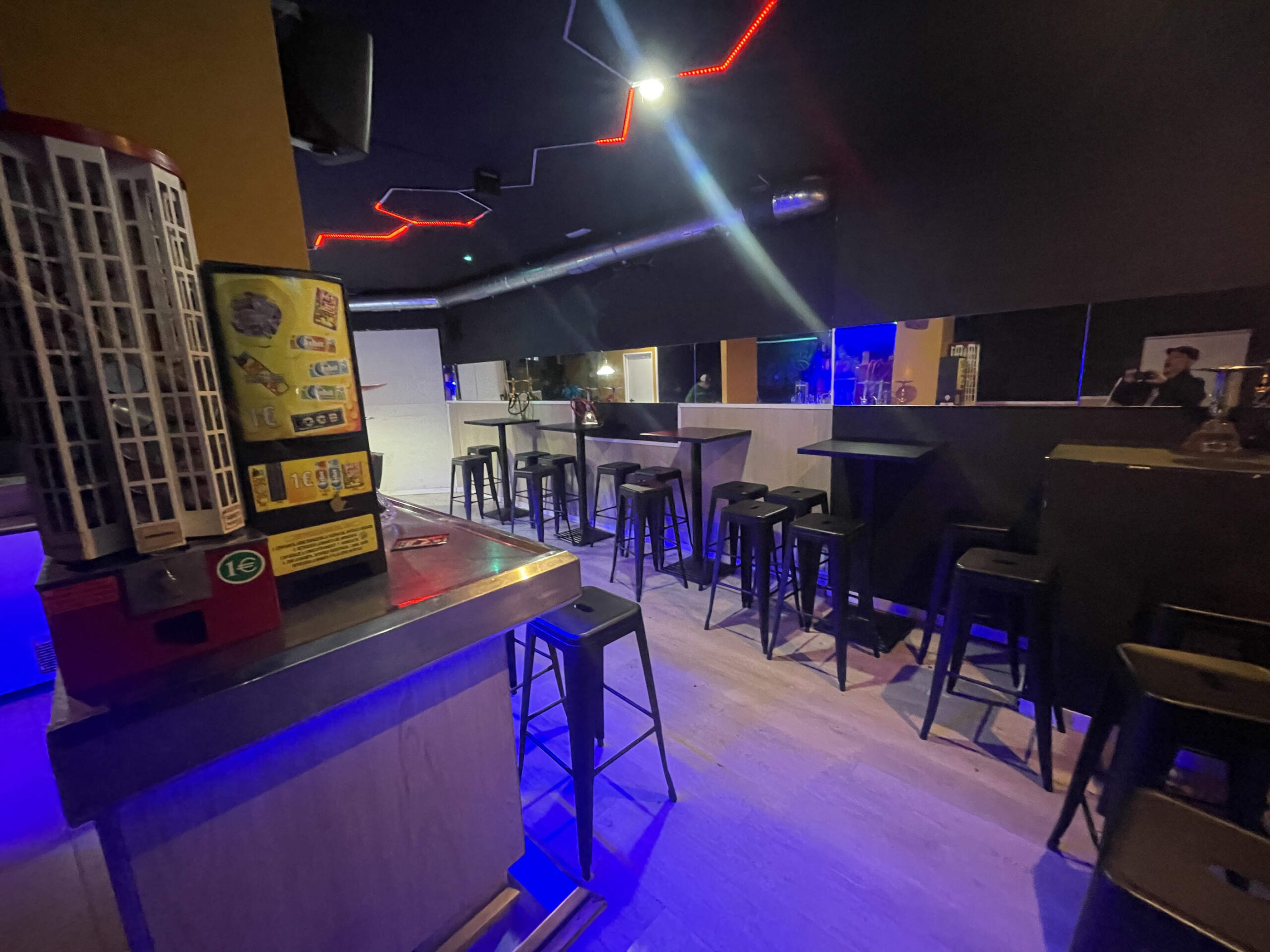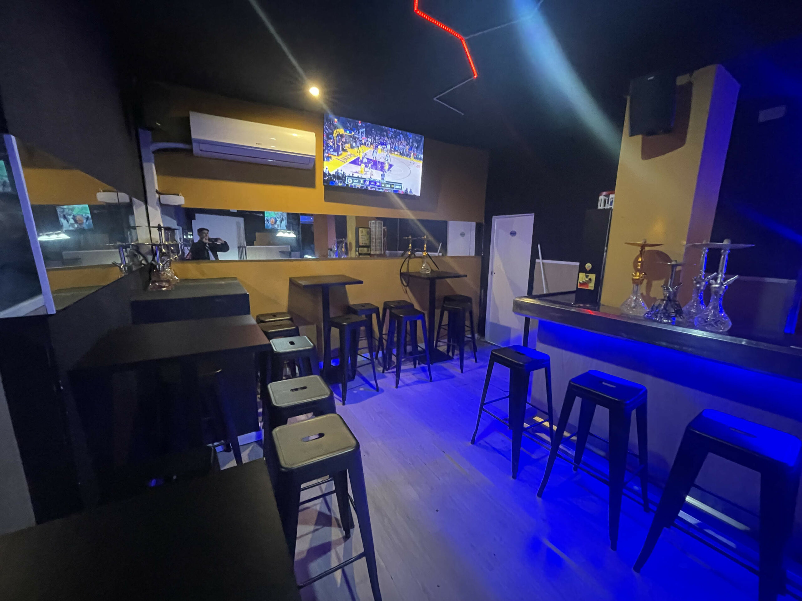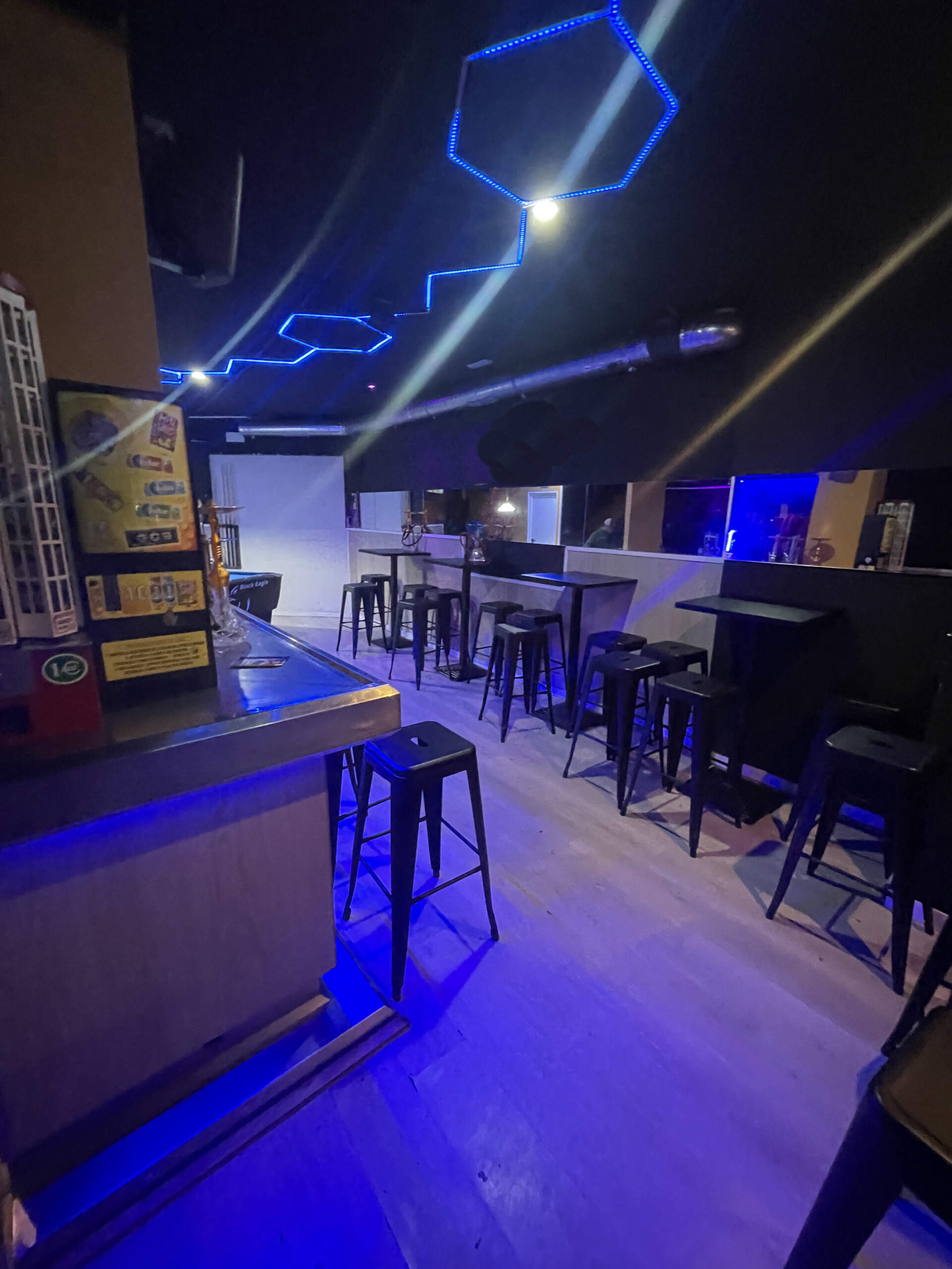 Zona de público: Aforo para 43 personas, con un ambiente cuidado, ideal para el consumo de shishas y copas de manera relajada.