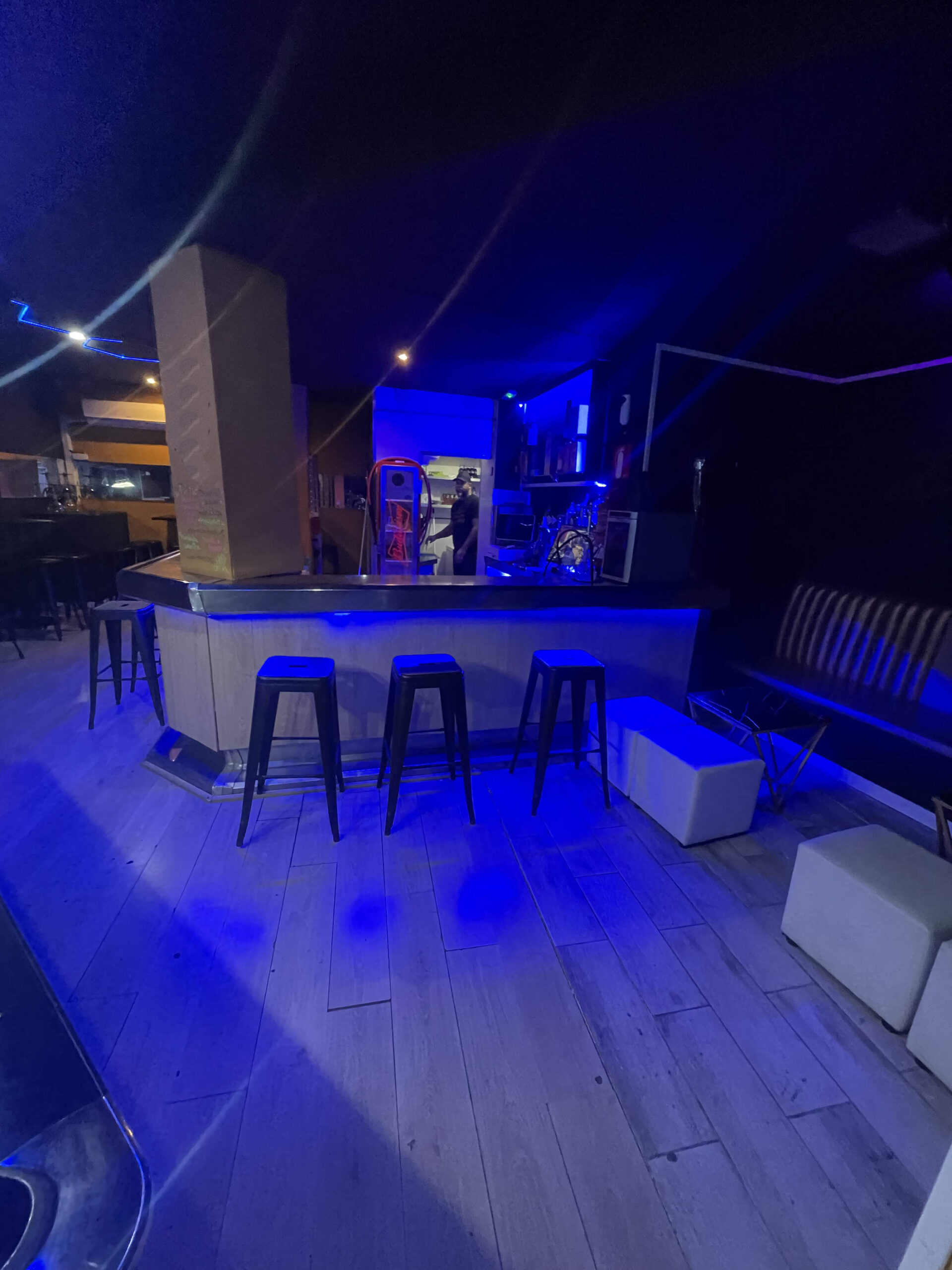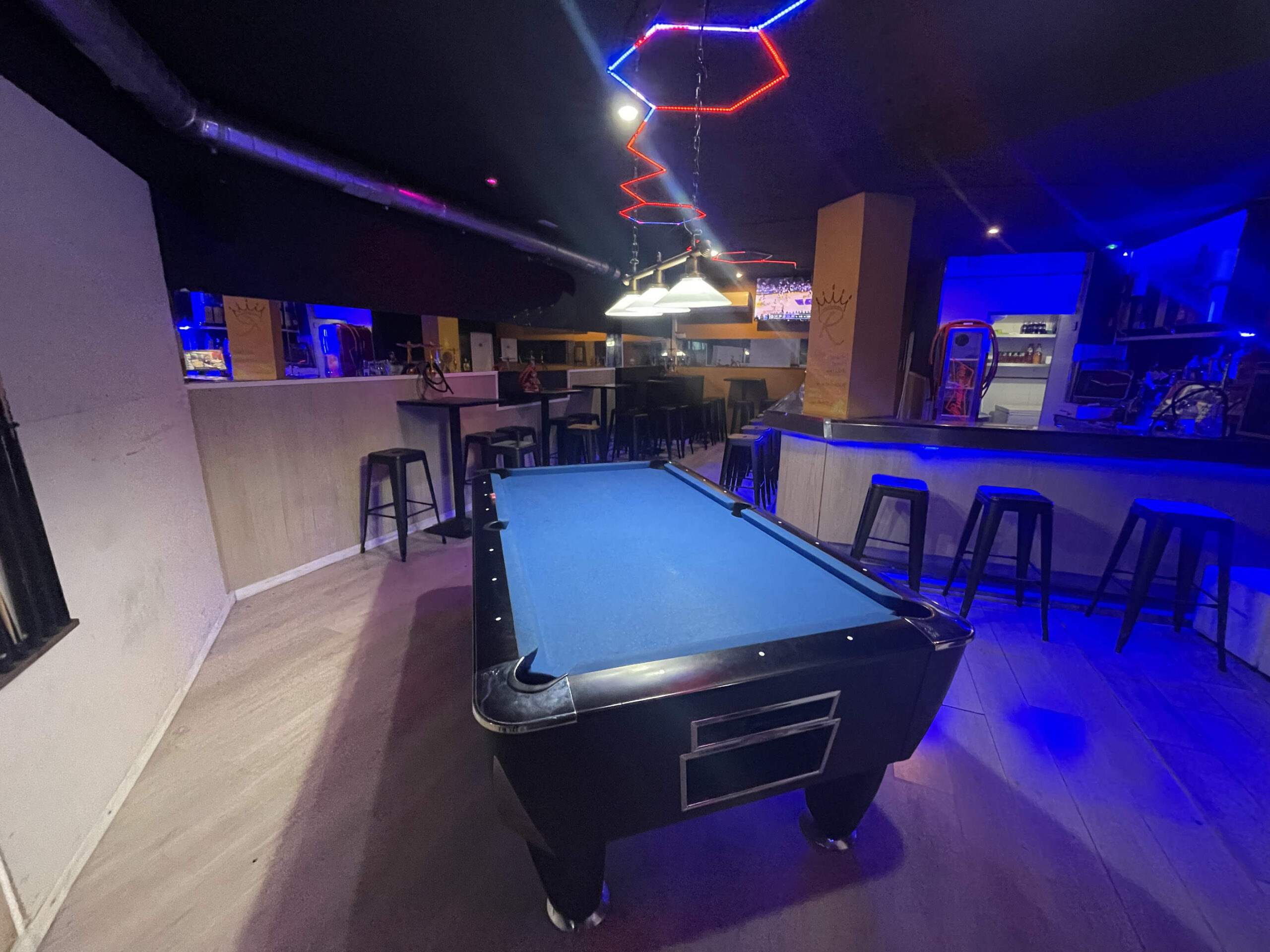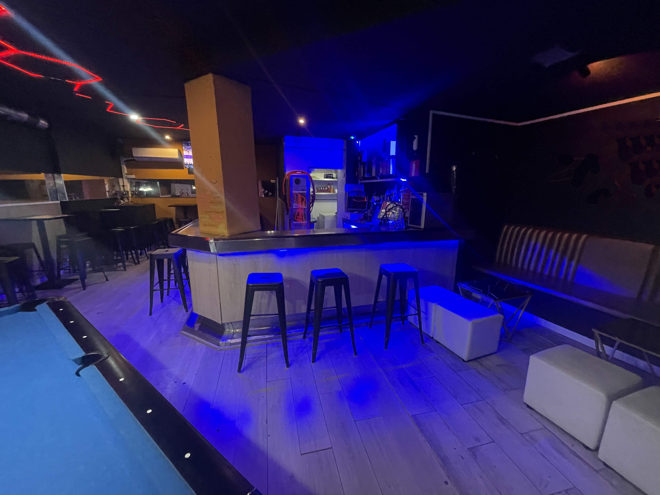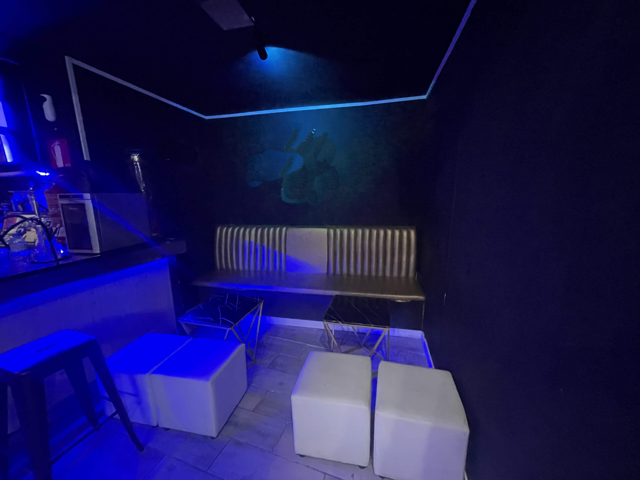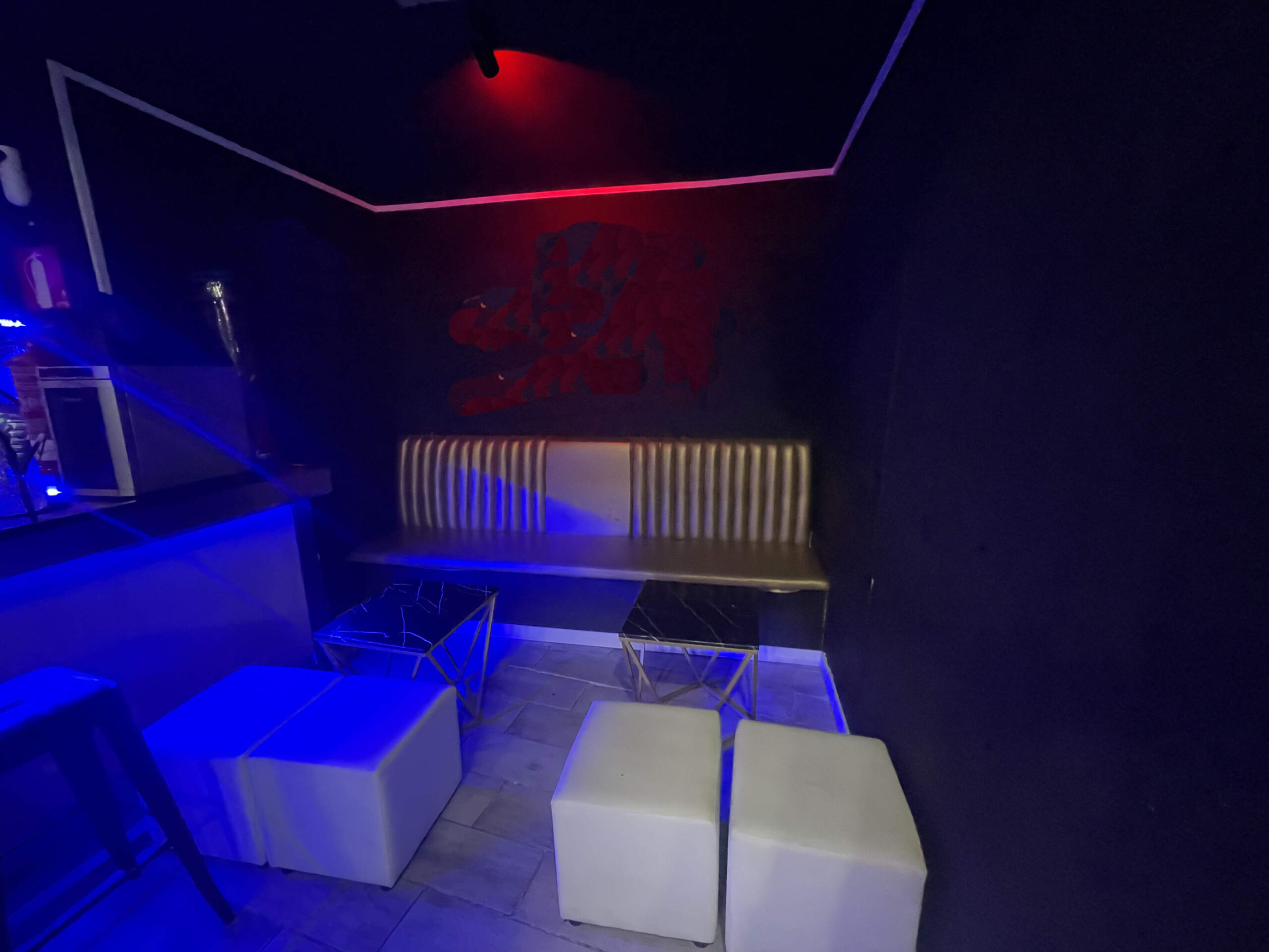 Zona de público: Aforo para 43 personas, con un ambiente cuidado, ideal para el consumo de shishas y copas de manera relajada.
